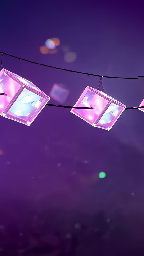 AI Generated Image. Showing close-up vertical video of glowing LED cube string sliding across purple void, pulsing pink and violet hues and throwing soft bokeh highlights. Featuring ambient futuristic mood, subtle camera shift, and slow shimmer for cinematic feel. Providing loop-friendly clip tailored for vertical formats and mobile-first projects. Suggesting uses: using as loopable background for social media reels, livestream intros, music visualizers, event promos, tech product showcases, and holiday or party adverts. Recommending placement: leaving negative space at bottom for vertical captions or logo overlays, applying gentle color grade tweaks to match brand palette, and syncing pulse to audio for rhythmic edits. Ideal for mobile wallpapers, app splash screens, stage visuals, and header video for creative portfolios.