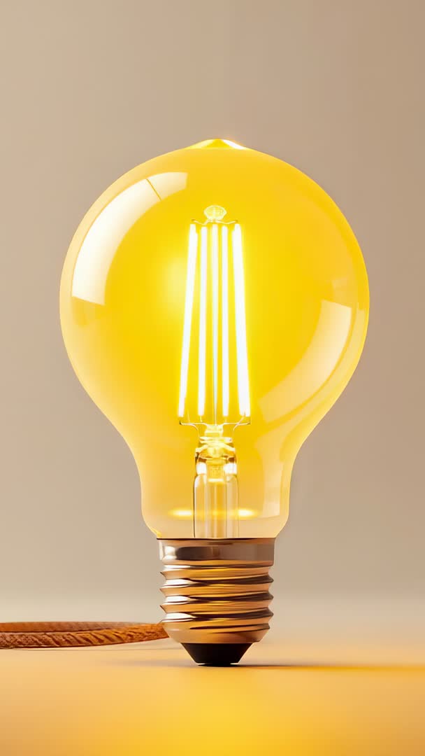 AI Generated Image. Showing close-up of glowing vintage LED filament bulb with braided cloth cord in studio. Presenting warm amber light and minimalist composition suitable for vertical 9:16 mobile screens. Working as hero clip for social media ads, Instagram Reels, TikTok, app intros, and product promotions. Supporting themes including energy efficient lighting, retro design, cozy interior, industrial decor, and creative idea concept. Allowing space for overlay text and logo on neutral background. Looping friendly for background motion or cinematic intro. Helping designers, marketers, bloggers, and lighting brands create warm emotional tone, highlight product features, or illustrate energy and innovation topics.