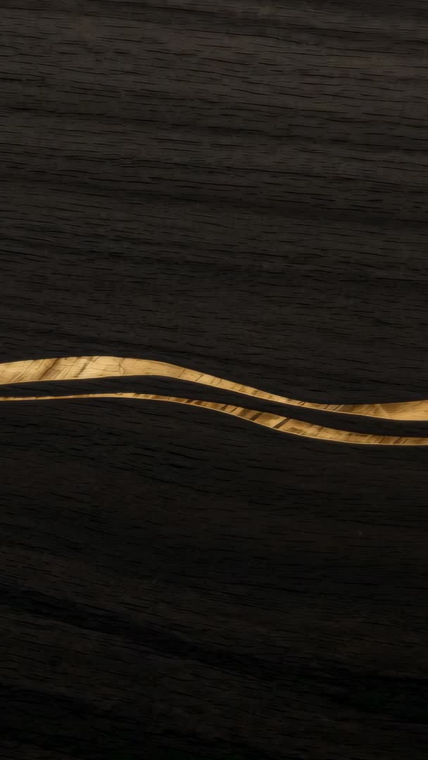 - Vertical video of gold inlays sliding across dark wood with metallic ribbon highlights
