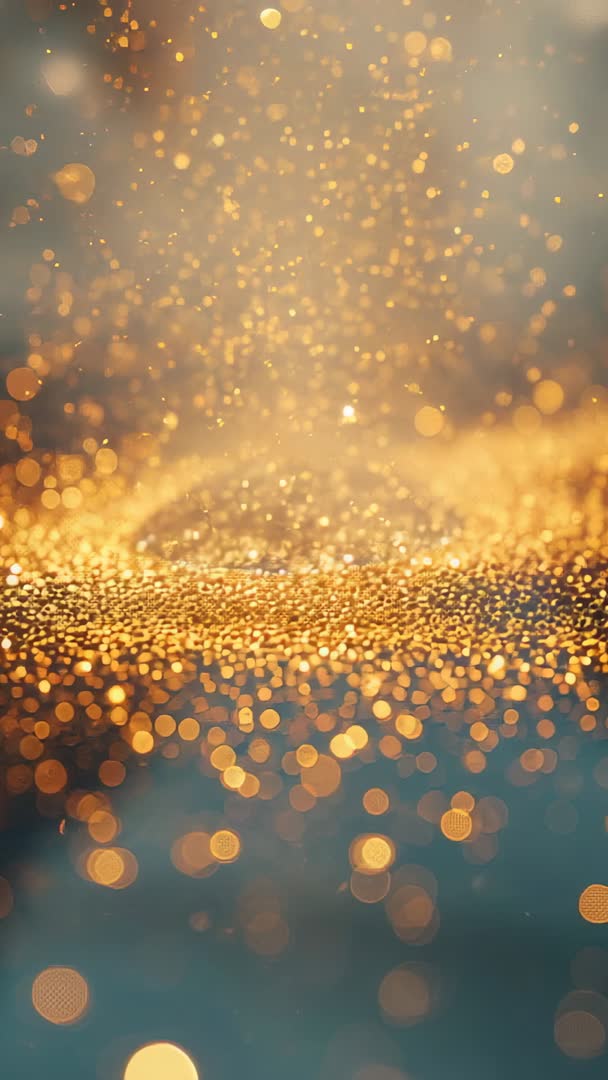 AI Generated Image. Showing close-up macro of golden glitter lifting from textured surface with warm bokeh glow and soft focus. Subtle upward motion and suspended particles creating calming, luxurious atmosphere. Working well as looping vertical background for social media stories, reels, mobile ads, and app intros. Complementing title reveals, product intros, holiday promotions, wedding montages, beauty and fashion campaigns. Providing clean space for overlaying text, logos, and motion graphics while maintaining cinematic shimmer. Suggested uses: color grading to match brand, adding gentle ambient music, looping for mobile, layering with text and logo animations.
