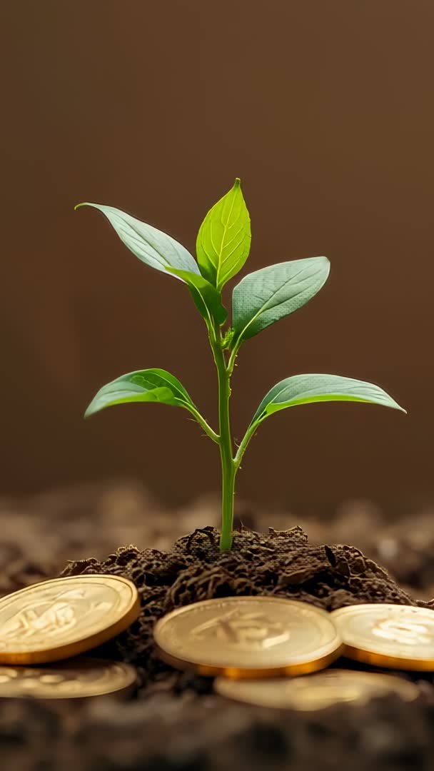 AI Generated Video. Showing closeup vertical clip of young green seedling growing from rich soil among scattered gold coins, symbolizing investment growth, financial return, and sustainable business development. Featuring warm brown backdrop and shallow depth of field, creating clean, minimal composition with strong contrast between green leaves and golden tokens. Ideal for use in finance websites, investment fund promos, startup pitch decks, crowdfunding campaigns, sustainability reports, mobile ads, and social media stories. Working well as hero banner, background for title cards, or looped short for vertical ads. Editing ideas include applying gentle slow zoom, adding text overlay for key messages, including logo reveal, color grading for richer gold tones, and adding subtle ambient soundtrack to enhance mood. Supporting cropping for portrait formats and pairing with infographic overlays for reporting, educational content, or campaign storytelling.