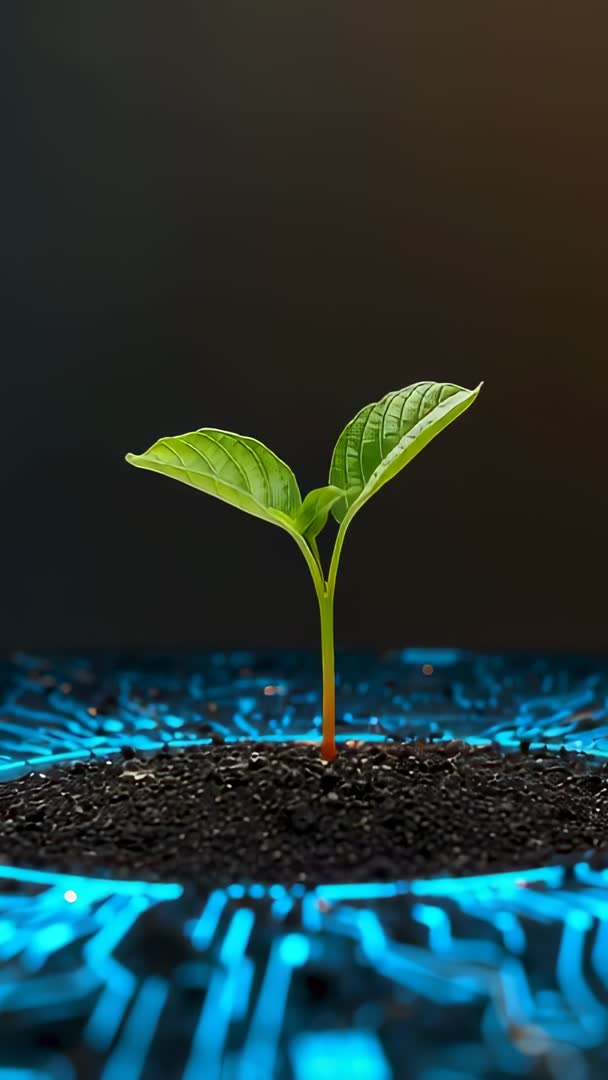 - Vertical video of green seedling sprouting from soil on glowing blue circuit platform