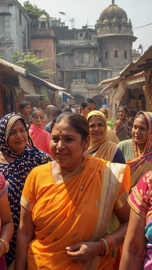 AI Generated Image. Vertical video showing Indian women leading group through bustling sari market lane, bright textiles and colorful headscarves creating vibrant palette. Lead woman smiling directly at camera while companions browsing stalls and vendors displaying fabric rolls. Background featuring layered urban architecture adding sense of place and depth. Ideal for travel and tourism promotions, cultural documentaries, lifestyle reels, retail campaigns for textiles and fashion, community stories, and editorial features on traditional clothing. Use for social media vertical formats including reels and stories, mobile ads, and immersive banner content. Pair with upbeat regional music or ambient market sound for authentic atmosphere. Frame allowing tight crop and subtitle placement for multilingual captions. Licensing suitable for commercial advertising, editorial coverage, content marketing, and stock footage libraries.