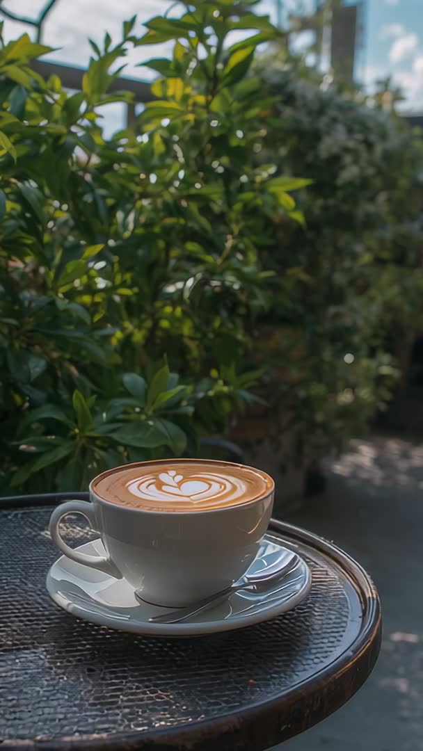 AI Generated Video. Video showing latte cup with heart latte art on mesh table, camera zooming in to bring cup into sharp focus while background greenery blurring into soft bokeh. Lighting casting warm morning glow on ceramic cup and saucer, spoon resting beside cup adding small detail. Footage conveying relaxed outdoor cafe atmosphere, slow cinematic movement creating cozy, inviting mood. Useful for social media reels, Instagram stories, YouTube shorts, coffee brand promos, cafe menu videos, lifestyle blogs, and advertising. Suitable as b-roll for barista tutorials, morning routine segments, and background for text overlays or product callouts. Color palette featuring warm browns, creamy foam, and lush green tones, matching wellness, slow living, and artisanal coffee themes.