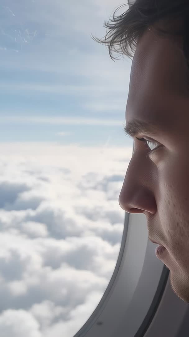 AI Generated Image. Vertical video showing male passenger gazing out airplane window while clouds fill view and horizon stretching toward distance. Close-up profile framing emphasizing emotion, contemplation, and quiet travel reflection. Ideal for travel brand ads, airline marketing campaigns, social media reels, vlog B-roll, in-flight comfort stories, and meditation or mindfulness content. Useful as intro clip for documentary sequences, airport lounge promotions, business travel narratives, or solo travel stories. Color palette offering soft sky blues and warm skin tones, easy to overlay with text, logo, or lower third. Vertical aspect ratio optimized for smartphone viewing and short-form platforms. Suggested edits include subtle slow zoom, gentle color grade, or ambient soundtrack to enhance reflective mood.