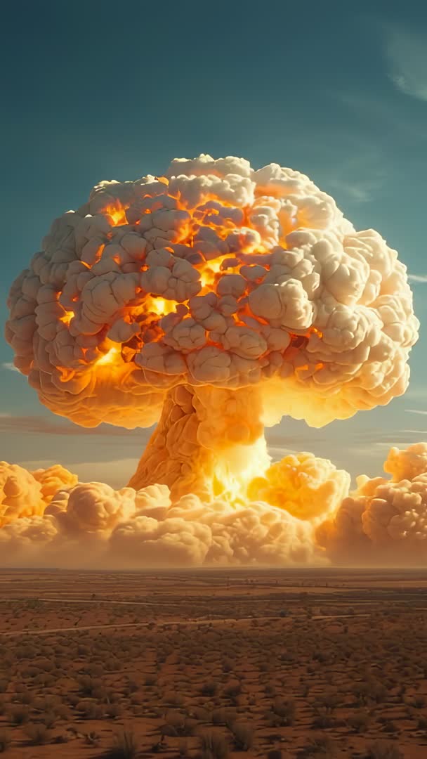 AI Generated Image. Featuring towering mushroom cloud and blazing fireball rising from desert plain, vertical video capturing dramatic explosion and billowing smoke. Intense orange and yellow light radiating through dense cloud structures, contrasting with clear blue sky. Working well for news segments, documentary sequences, emergency response training, military history features, cinematic VFX reels, book covers, poster art, website hero banners, and social media short clips. Providing striking visual for headlines about nuclear testing, large-scale accidents, apocalyptic storytelling, and disaster preparedness campaigns. Recommending slow-motion playback, impactful sound design, and cinematic color grading to enhance mood. Suitable for editorial use and licensed commercial projects with careful contextualization. Including suggestions for overlay text, lower thirds, or motion graphics to communicate message and call to action.