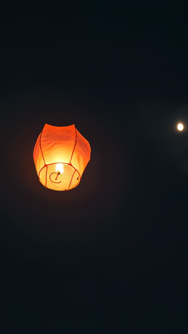 - Vertical video of orange sky lantern rising at night with glowing flame and moon