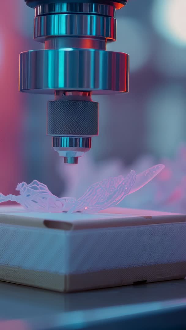 AI Generated Image. Scene showing precision spindle descending and rising over translucent prototype butterfly on padded bench. Neon blue and pink lighting creating futuristic industrial mood while focus stays on tool tip and delicate lattice structure, highlighting precision machining and prototyping workflow. Visual suiting manufacturing and engineering marketing, product development demos, prototyping service websites, training material for CNC and additive hybrid workflows, social vertical ads and short-form reels. Editing suggestions include slow motion for tool interaction, loop clip for seamless background, closeup crop for mobile ads, and overlaying technical callouts or animated logo. Licensing ideas include using in online presentations, trade show displays, startup pitch decks, technical blogs, and industrial automation campaigns.