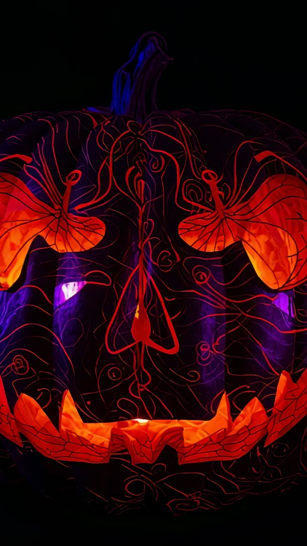 AI Generated Image. Showing vertical 9:16 clip of carved pumpkin glowing with pulsing orange and purple light, revealing intricate vine filigree carving and menacing grin. Providing cinematic contrast and moody shadows that enhance ornate lines and haunted mood. Working as loopable background for Halloween social media stories, mobile ads, haunted house promos, seasonal marketing, title intros, and party invites. Suggesting ambient synth or suspenseful strings for soundtrack and slight color boost to emphasize warm highlights. Recommending keeping duration under 15 seconds for social sharing and optimizing loop point for seamless repeat. Serving well for product landing headers, event posters, editorial Halloween features, and motion graphics overlays with text or logo.