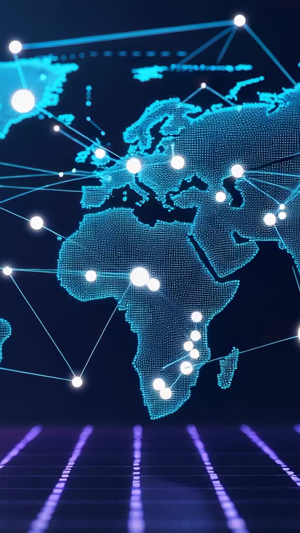 AI Generated Image. Vertical loopable video featuring pulsing network nodes across Europe and Africa on neon digital grid. Suiting corporate tech presentations, telecom and internet service provider websites, cybersecurity and data center promotions, fintech and startup pitch decks, broadcast news graphics covering connectivity and global infrastructure. Working well as background for mobile app demos, social media vertical ads, event displays, trade show booths. Offering ample negative space for text and logo overlays while providing smooth motion for looping. Allowing easy color grading and branding with neon blue palette. Including close node pulses and wide network lines for layered animation and infographic transitions. Recommending use as hero banner for landing pages, lower thirds and title sequences, animated openers for tech videos, mobile-first vertical storytelling. Providing deliverables compatible with modern editing software and loop-ready formats.