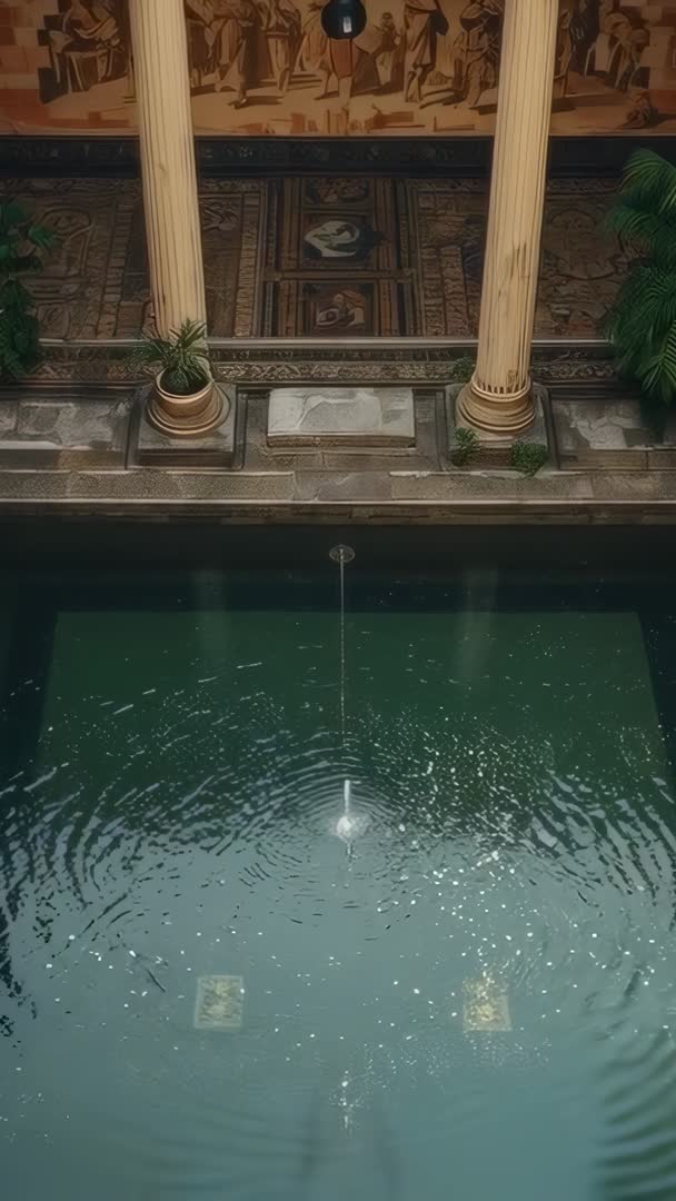 AI Generated Video. Footage showing overhead view of pulsing fountain in ornate mosaic pool framed by fluted columns and frescoed frieze. Water rippling outward from rhythmic jet while floating leaves drift across deep green surface and subtle reflections shimmer. Scene offering calm ornamental detail suitable for hospitality promos, museum or heritage documentaries, architecture reels, wellness and meditation content, travel social stories, luxury hotel marketing. Clip working well as loopable background for mobile stories and vertical ads, with natural ambient sound enhancing mood. Editing tips: consider slowing motion for soothing effect, gentle color grade for warm cinematic tone, cropping for safe margins on 9:16 platforms, and adding soft ambient audio for immersive experience.