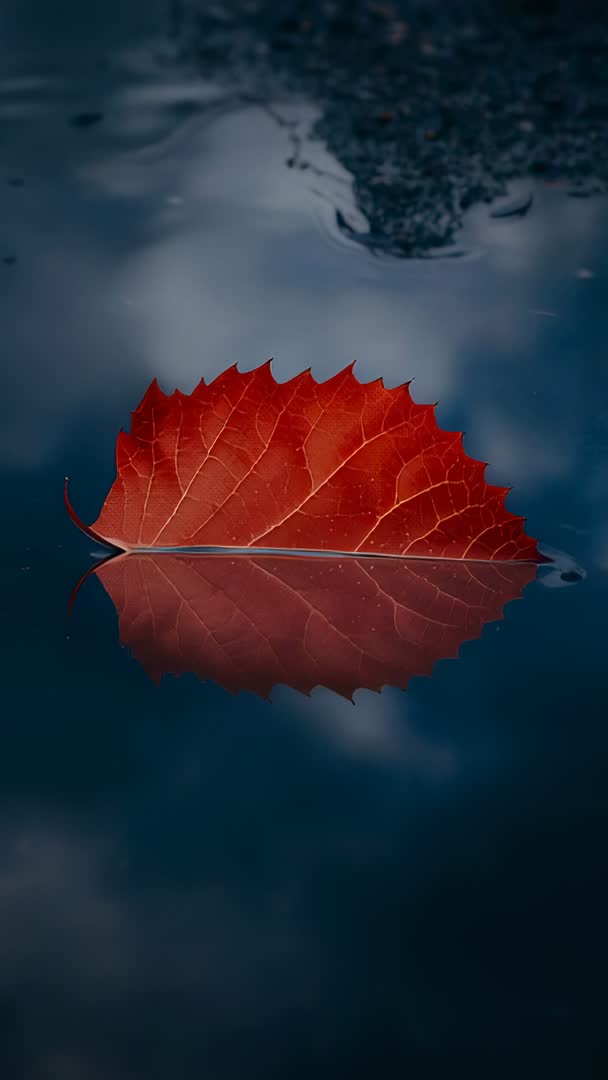 AI Generated Video. Vertical video showing red serrated leaf floating on calm shallow pool, reflecting on glassy surface while ripples forming at top right. Macro framing highlighting intricate vein pattern, serrated edge and saturated scarlet color against deep blue water. Mood leaning toward tranquil, moody, minimalist nature study suitable for seasonal storytelling. Ideal for vertical social media stories, phone wallpapers, meditation or mindfulness backgrounds, seasonal advertising, nature blog headers, greeting cards and desktop or mobile video loops. Technical notes: vertical 9:16 orientation, shallow depth of field, soft bokeh and high color contrast, suitable for slow motion or cinematic edit.