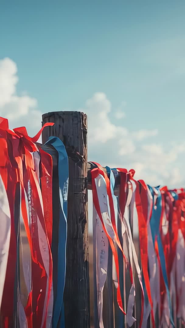 AI Generated Image. Vertical video showing close-up of weathered wooden post wrapped with red, white and blue ribbons, breeze making streamers flutter and twist against blue sky with soft clouds. Sunlight catching ribbon sheen and casting warm highlights on worn wood, shallow depth of field creating cinematic background blur. Knots and frayed ribbon edges adding rustic, nautical character. Ideal for social media reels, vertical ads, patriotic holiday content, event promos, coastal tourism features, festival coverage, and lifestyle videos. Useful as loopable B-roll for background video, hero banner, title reveal, or greeting card animation. Recommend gentle slow-motion playback, warm color grade, and seamless loop editing for mobile-first platforms and storytelling sequences.