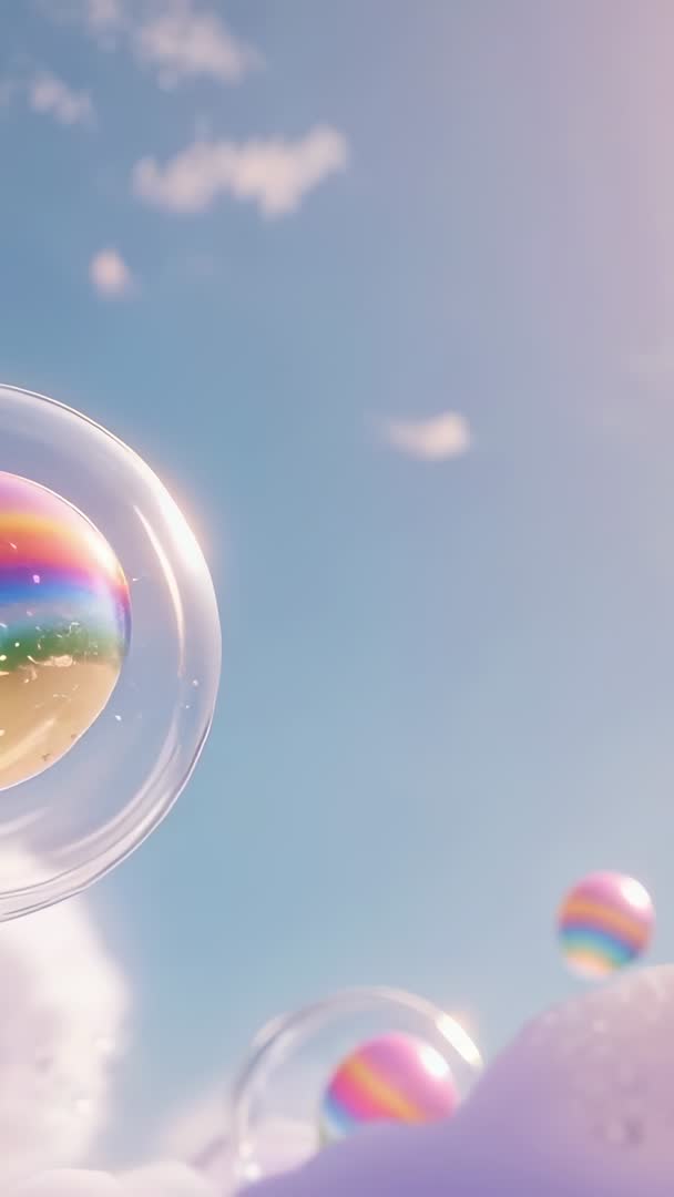 AI Generated Image. Vertical 9:16 video featuring rising soap bubbles with rainbow spheres drifting across blue sky. Soft pastel tones and gentle sunlight creating calming, dreamy mood for digital projects. Serving as loopable background for mobile app interfaces and social media stories. Enhancing meditation and relaxation videos by adding tranquil, ethereal motion. Complementing children's content and fantasy promos with playful, colorful elements. Supporting brand intros and product ads for beauty, wellness, lifestyle through soft luminous visuals. Providing negative-space composition ideal for overlaying text and logo in upper right area. Applying slow motion and color grading to boost pastel hues, adding subtle particle overlays for added depth. Delivering vertical format ready for Reels, Stories, TikTok and mobile wallpapers.