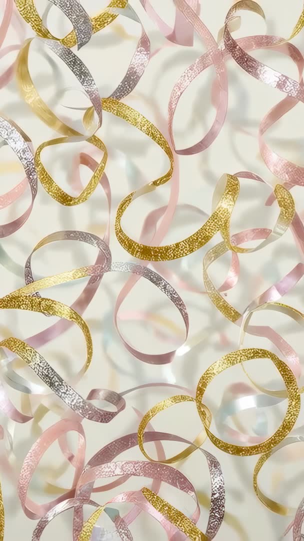 AI Generated Video. Camera shifting metallic ribbons rotating against pale wall, revealing gold and silver sheen and glittering highlights. Soft shadows and subtle bokeh creating layered depth while ribbons are looping and spiraling in slow, graceful motion. Loopable vertical sequence working for social media stories, reels, phone wallpapers, event promos, and product reveal overlays. Use as background for wedding title cards, New Year greetings, holiday messages, luxury brand ads, beauty and fashion content, or celebration invitations. Adjusting speed, cropping, and adding text or logo overlays for elegant motion graphics and short-form video content.