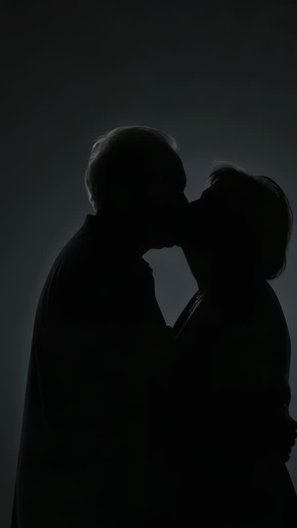 AI Generated Image. Showing senior couple pressing foreheads and sharing gentle kiss in dramatic backlit silhouette, filmed in vertical format. Highlighting themes of enduring love, companionship, tenderness, and deep emotional connection between older adults. Working well for eldercare campaigns, retirement community promotions, relationship advice clips, anniversary videos, and social media reels. Allowing overlay of text or logos on negative space above subjects and fitting portrait-oriented platforms like Reels and Stories, delivering intimate cinematic look for commercial projects targeting mature audiences.