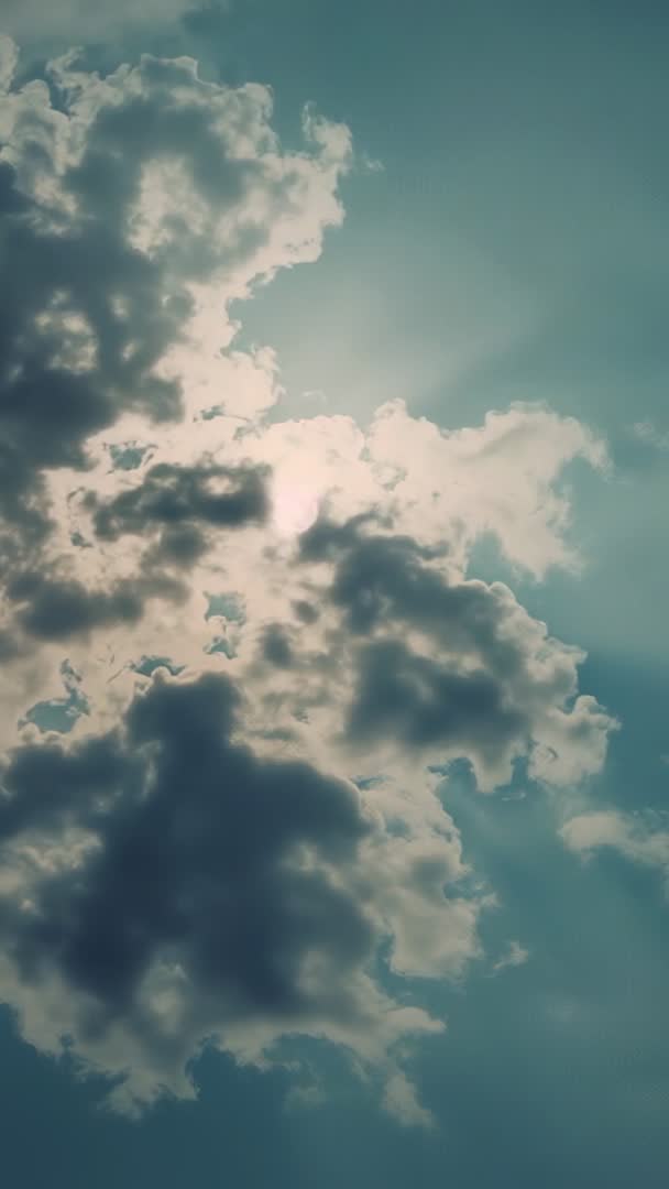 AI Generated Image. Clip showing shifting cumulus clouds drifting across turquoise sky, revealing sunburst and casting warm rays with soft halo. Backlit clouds creating high-contrast silhouettes and glowing edges, producing cinematic mood and strong sense of movement. Vertical framing optimizing use for mobile stories, reels, and vertical ads. Suitable for nature montages, weather segments, meditation and wellness backgrounds, title intros, cinematic transitions, and social media campaigns. Working well as looping background after simple trim, and responding nicely to color grading and gentle speed ramps for dramatic reveal. Suggested edits include overlaying inspirational text, adding ambient music or nature soundscape, applying teal-and-orange grade or keeping natural vibrance, and combining with time-lapse sequences for editorial projects. Delivering flexible vertical footage for broadcast, digital marketing, app backgrounds, and relaxation content.
