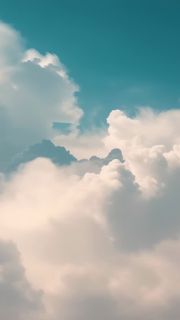 AI Generated Image. Video showing shifting cumulus clouds swelling under teal sky, sunlight highlighting edges and casting soft shadows. Vertical composition capturing expansive cloud layers and deep sky for immersive smartphone viewing. Soft pastel color palette blending teal and warm white, creating tranquil, airy mood. Gentle motion suggesting wind and slow atmospheric change, with slight video artifact adding subtle texture. Suitable for meditation app backgrounds, social media stories and reels, travel or weather segments, inspirational quote overlays, title sequences, and ambient B-roll. Creative uses include phone wallpaper, hero header for websites, calming loop for waiting screens, or overlay for product presentations and branding. Technical tips: pair with ambient music, add slow zoom or parallax for extra depth, apply gentle color grade for cohesive palette, export as loopable MP4 for seamless playback.