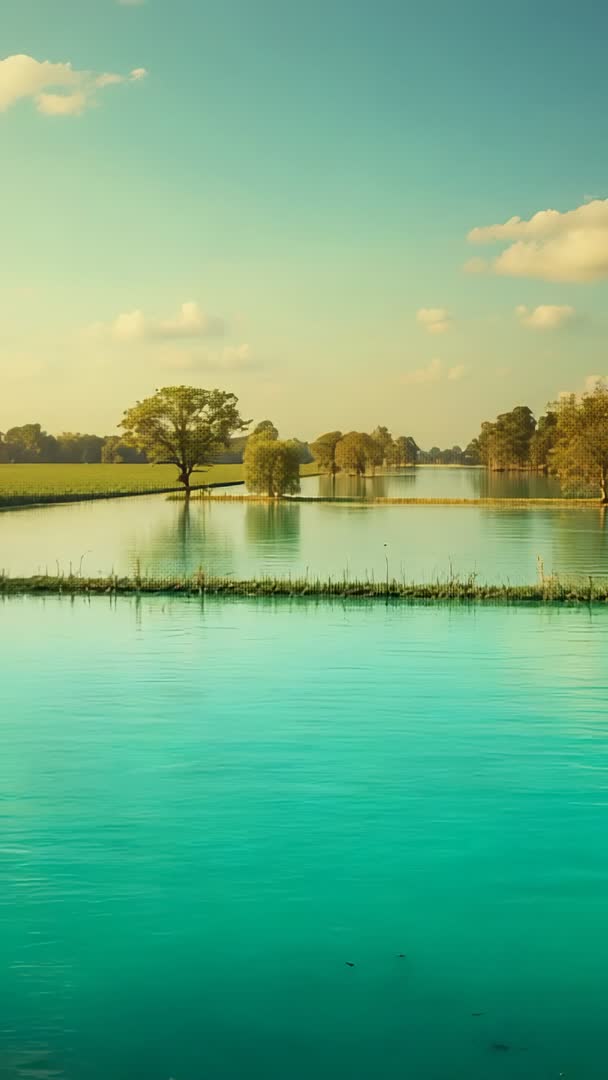 AI Generated Image. Vertical video capturing shimmering island trees reflecting on calm turquoise pond while light breeze creating gentle ripples across water. Soft clouds drifting across pale sky and sunlight warming distant fields. Scene offering tall composition ideal for mobile-first formats such as Instagram Stories, TikTok, Reels, and vertical ads. Visual providing tranquil background for wellness, meditation, travel, and real estate projects. Video working well as hero footage, looping ambient clip, social media opener, or broadcast lower third. Color palette lending to branding, web banners, print layouts, and calming screensavers.