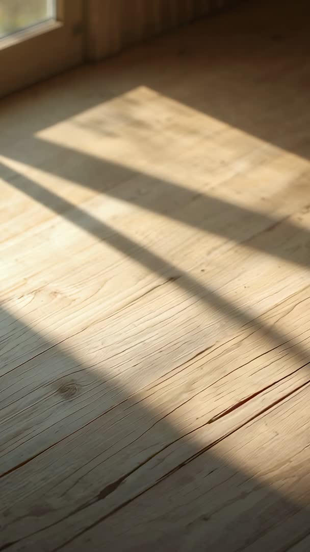 AI Generated Video. Featuring warm morning sunlight sliding across rustic pine floorboards through window mullion, creating rectangular sun patch and long soft shadows. Close-up on wood grain, knots, and surface crack with subtle lateral movement matching sun progression. Vertical 9:16 composition and natural light mood working well for background loops, social media stories, vertical ads, mindfulness or relaxation content, home decor and flooring promotions, architecture and interior design reels, real estate listings, seasonal campaigns. Pairing easily with on-screen text, product overlays, or ambient music to create calm, cozy atmosphere. Editable color grading and speed for use as timelapse, slow-motion loop, or cinematic b-roll.