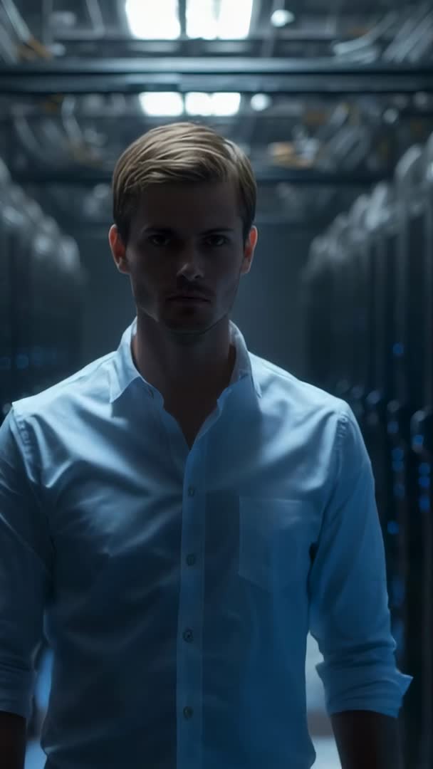 AI Generated Image. Vertical video showing technician walking down dim server aisle while inspecting racks and monitoring network uptime. Providing cinematic b-roll for technology marketing, cybersecurity campaigns, data center tours, corporate training, and vertical social ads. Lighting creating dramatic silhouette and cool blue tones, conveying professionalism, focus, and high-stakes infrastructure. Optimized for vertical platforms, supporting mobile ads, Instagram Reels, TikTok, LinkedIn stories, and website hero video. Working well with lower-third graphics, overlay text, voiceover, and branded calls-to-action for recruitment, case studies, product demos, or editorial coverage of cloud and network operations.