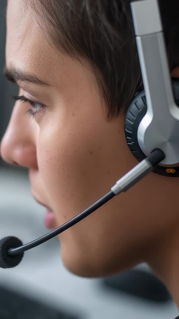 AI Generated Image. Vertical close-up video showing teen wearing silver-black headset with boom microphone, speaking and focusing at desk during online lesson or support call. Side profile framing emphasizing concentration, clear audio gear, and skin detail, with background softly blurred for professional look. Footage working well for remote learning, online tutoring, customer support training, call center recruitment, and technology product promotion. Clip fitting mobile-first social media ads, vertical app content, website hero reels, e-learning course intros, and corporate training modules. Suggestions for use: add captions or lower-third text for dialogue, overlay branding and call-to-action for headset or telecom campaigns, pair with instructional voiceover for tutorial content, and edit into montage of remote work scenes for marketing or educational playlists.