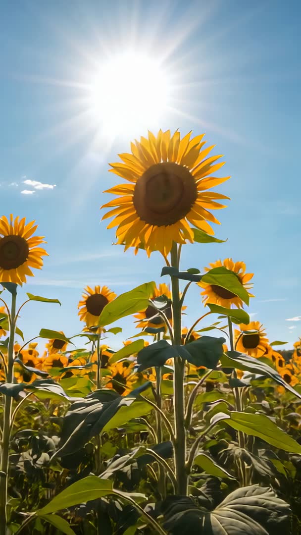 AI Generated Image. Vertical video capturing tall sunflower head backlit by bright sun, petals glowing golden against vivid blue sky. Camera tilting upward through dense field, creating strong perspective lines and dramatic sun flare for cinematic look. Warm tones and high contrast conveying uplifting, summery mood suited for seasonal storytelling. Ideal for social media vertical ads, Instagram Reels, TikTok, mobile wallpapers, travel and nature vlogs, agricultural promotions, wellness and eco branding. Recommended usage includes cinematic B-roll, hero clip for title screens, background for inspirational quotes, product overlays, loopable ambient footage for storefront displays and website headers.