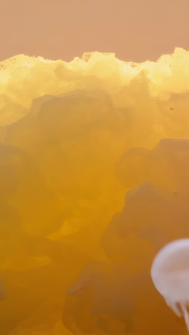 AI Generated Video. Vertical footage showing pale translucent jellyfish bell rising, medusa drifting upward through warm golden water. Soft sunlit glow creating ethereal amber tones and gentle diffusion of light. Minimal composition focusing on medusa silhouette and fluid motion, vertical framing matching mobile screens and social media reels. Serving nature documentaries, underwater sequences, environmental awareness campaigns, relaxation or mindfulness videos, wellness and spa promotions, and ocean conservation projects. Working well as background clip for title cards, transitions, looping ambient footage for apps, or cinematic overlay for promotional videos. Ideal for slow motion playback, calming visual loops, or paired music for meditation and spa content. Color palette dominated by warm amber and gold tones while maintaining translucent cool gradients around bell. Capture originally vertical 9:16 aspect ratio, ready for mobile-first distribution.