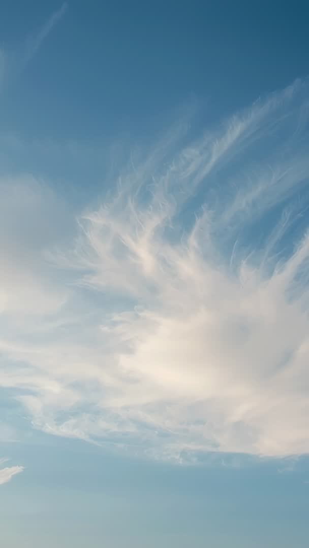 - Vertical video of wispy cirrus clouds drifting across calm azure sky, high-altitude motion
