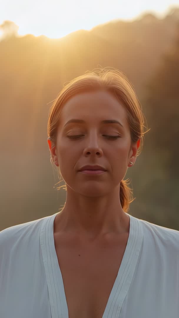 AI Generated Image. Footage showing woman breathing and meditating on hillside at sunrise with warm golden backlight and sun halo. Close-up portrait highlighting calm facial expression, slow breath, relaxed posture, and soft natural light. Vertical frame optimizing for mobile platforms, social short-form video, and app intros. Usage ideas include mobile meditation app intro, guided breathing exercise background, wellness brand ad, spa promotion, mindfulness course trailer, yoga retreat promo, and social feed calming clip. Visual attributes include warm color palette, shallow depth of field, gentle lens flare, and cinematic mood. Licensing suitable for commercial wellness campaigns, lifestyle marketing, mental health awareness materials, and peaceful content libraries.