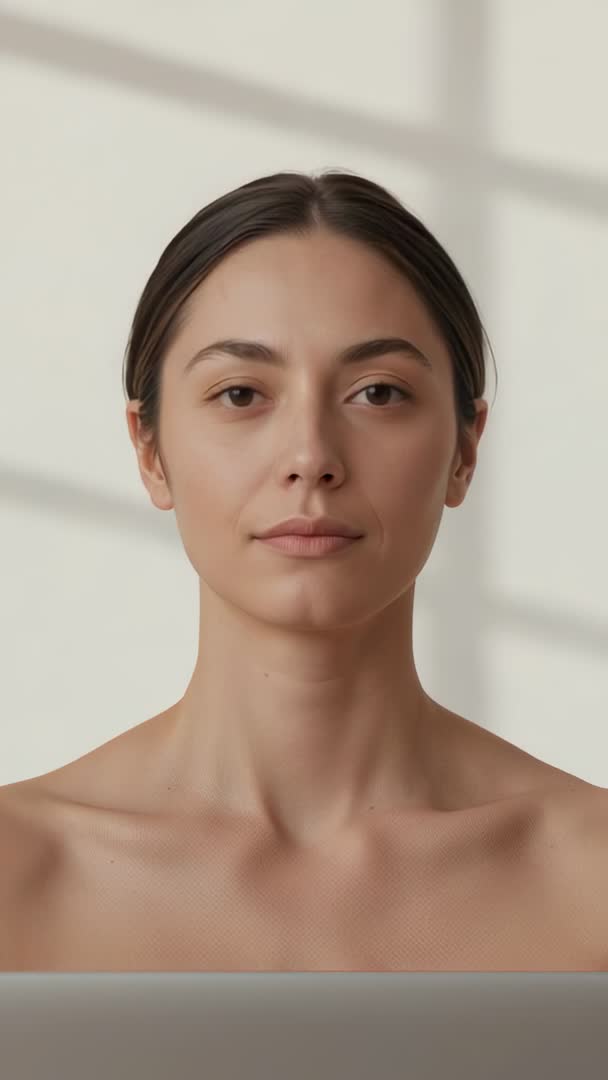 AI Generated Video. Featuring young woman opening eyes and posing at laptop in vertical 9:16 format, soft natural light, bare-shoulder minimalist composition. Close-up portrait framing with calm neutral expression, direct gaze, and relaxed posture. Ideal for beauty and skincare tutorials, wellness and mindfulness videos, remote work and productivity content, personal branding reels, app demos, editorial features. Background offering clean negative space for text overlay and lower third graphics. Footage being edit-friendly for color grading, slow motion, and cutaway sequences. Model presenting authenticity and quiet confidence, suitable for campaigns emphasizing natural beauty, healthy lifestyle, professional yet approachable online presence.