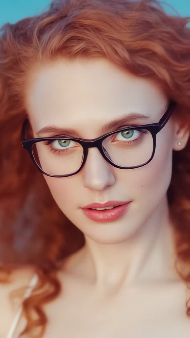 AI Generated Video. Vertical video capturing woman shifting in warm golden light, wearing black frames and strappy top. Close-up portrait emphasizing green eyes, clear skin, soft makeup, textured auburn curls. Cinematic shallow depth of field creating intimate, stylish mood, ideal for beauty, eyewear, fashion campaigns. Useful for social media reels, Instagram stories, TikTok content, landing page hero clips. Also fitting for lifestyle branding, optometry ads, makeup tutorial intros, model portfolio reels. Color grading suggesting warm tones and golden hour glow, allowing easy integration into commercial edits. Clip offering crop options for thumbnails and captions while preserving vertical composition.