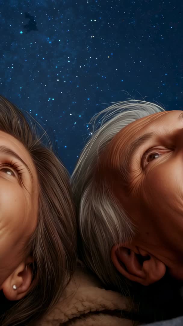 AI Generated Video. Vertical clip showing older couple lying on blanket in backyard, wearing warm coats and watching starry sky while smiling and sharing quiet moment. Tight framing on faces and upper torsos creating intimate, emotional feel. Soft starlight and deep blue night sky providing cinematic backdrop. Ideal for promoting senior lifestyle, retirement community activities, couples counseling, dating services for older adults. Useful for social media vertical ads, Instagram Stories, TikTok campaigns, mobile banners and app promos. Great for romance storytelling, anniversary or Valentine's Day content, greeting card animations, and astronomy outreach or star party promotions. Vertical-first composition leaving room for overlay text or logo at top or bottom, and color palette matching warm, cozy, contemplative narratives.