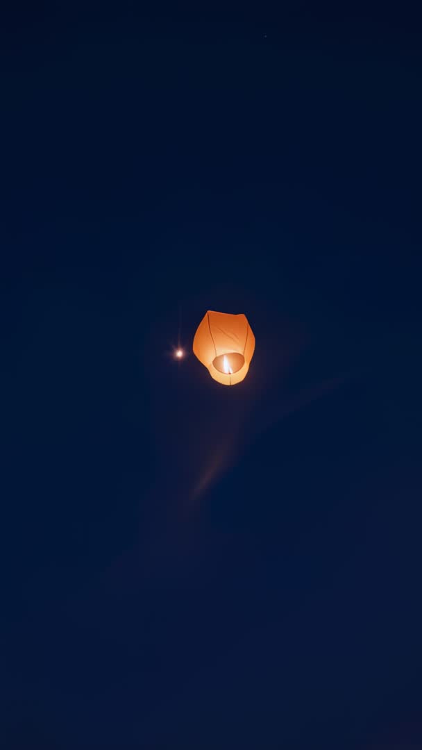 - Vertical video Orange sky lantern rising into deep navy night with warm glowing flame