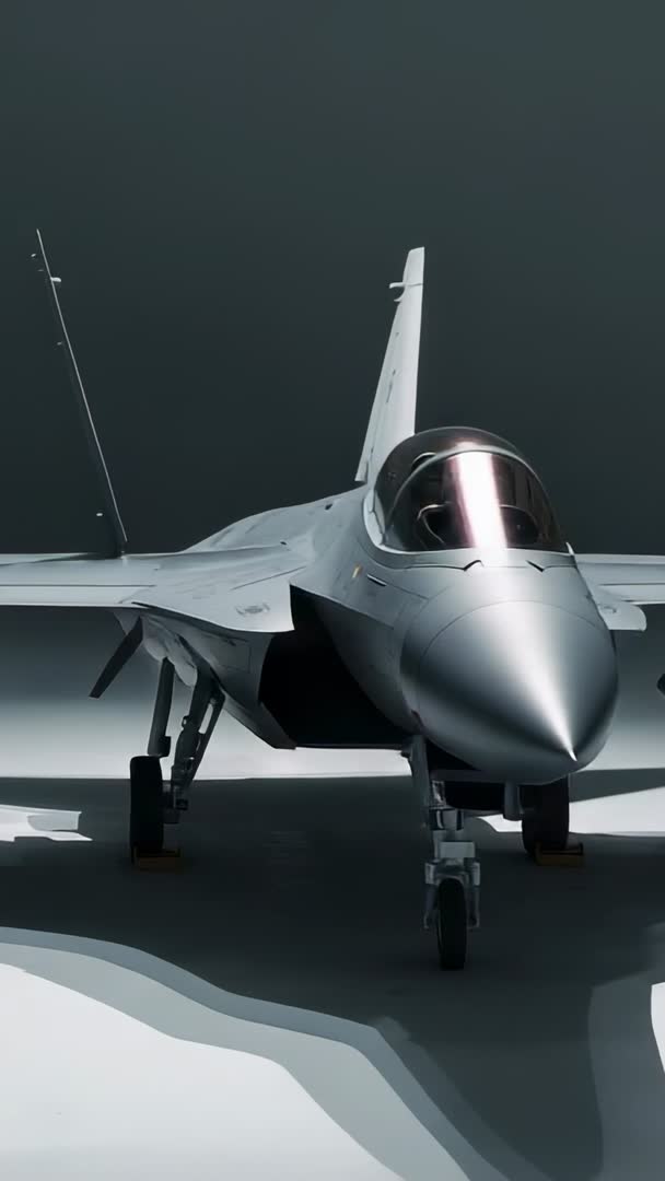 AI Generated Image. Vertical cinematic clip showing camera orbiting stealth fighter jet on white platform and slowly revealing cockpit canopy and nose. Dramatic studio lighting creating strong highlights and deep shadows, muted cool tones enhancing modern military aesthetic. Front-on composition leaving negative space at top for titles or logo. Ideal for aerospace marketing, defense presentations, product launch reels, documentary openers, vertical social ads, Instagram Stories, TikTok, YouTube Shorts, trade show loops. Editing suggestions: apply slow zoom and subtle camera stabilization, add ambient electronic soundtrack, use animated lower third to display aircraft specifications, introduce smooth crossfade to close-up cockpit. Suitable for hero banner, promotional campaign, technical explainer, concept video, or background loop for booths and presentations. Clip supporting 9:16 vertical format and high-resolution delivery.