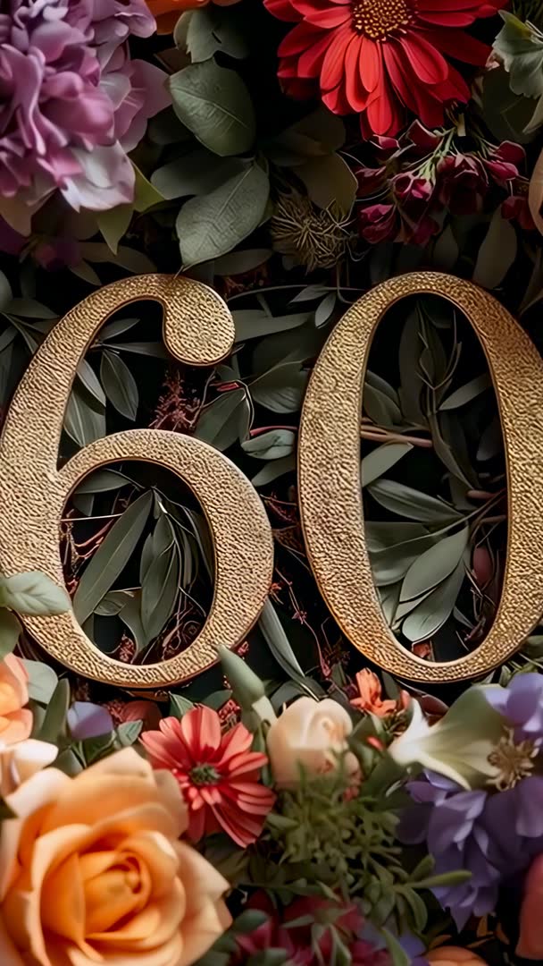 AI Generated Video. Panning across lush floral wreath while highlighting textured gold 60 numeral and vibrant foreground blooms. Ideal for 60th birthday, 60th anniversary, milestone celebration promos, event invites, social media shorts, Instagram stories, vertical ads. Using as loopable background for title cards, lower thirds, countdowns, and slideshow openers. Allowing easy overlay of custom text and logos with dark foliage providing contrast for gold numerals. Shooting style cinematic pan with shallow depth of field and rich color palette creating elegant celebratory mood.