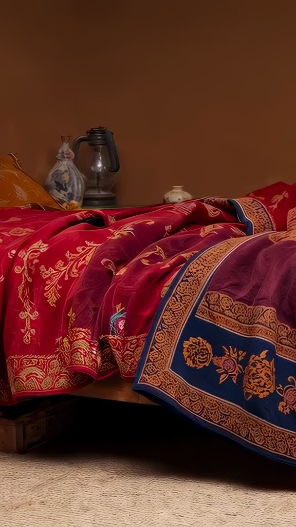 AI Generated Video. Panning shot revealing low wooden bed draped in ornate red textile with deep blue patterned border and gold embroidery. Camera moving slowly across layered folds and embroidered motifs, capturing tactile detail and warm color palette. Warm lantern and ceramic jug sitting on bedside surface, woven rug beneath bed adding texture and cozy contrast. Mood conveying intimate, cozy, vintage, handcrafted atmosphere. Usage ideas: Working well for interior design video content, bedding product showcase, textile brand social media reels, online store hero clips, lifestyle blog headers, cultural or travel documentary b-roll, seasonal promotion background. Editing notes: Slow pace and soft focus complement intricate detail; crop-friendly vertical format optimized for mobile and social platforms; color grading emphasizing warm tones recommended.