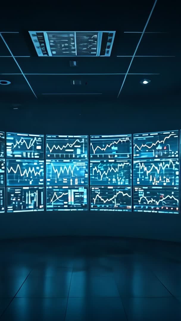 AI Generated Image. Panning vertical video revealing multi-screen monitor array displaying live time-series charts, performance metrics, and dashboard widgets in cool blue tones. Featuring continuous data updates and dynamic graph animations, useful for illustrating monitoring, trading desk activity, network operations, or analytics platforms. Ideal for corporate technology presentations, fintech marketing, newsroom backgrounds, website hero banners, social media vertical stories, and app promo reels. Pairing with voiceover or on-screen captions for explainer sequences, or using as looped background behind product demos, investor pitches, and training materials.
