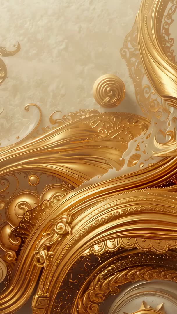 AI Generated Video. Vertical video panning across ornate gilded baroque relief, revealing medallion, beaded trim, rosettes, sunburst motif and flowing scrollwork. Rich gold tones and high-detail embossing creating luxurious cinematic atmosphere, suiting vertical displays. Serving as backdrop for luxury brand promos, jewelry product reveals, boutique hotel lobby loops, classical music concert promos and heritage restoration features. Recommending looping short segment for social media reels and stories, adding subtle parallax or vignette for depth, pairing with warm color grade and soft orchestral soundtrack. Delivering elegant background for branding, packaging mockups, editorial headers, motion graphics overlays and interior design presentations.