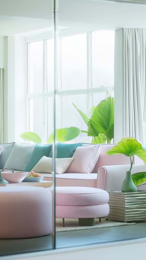 AI Generated Video. Panning vertical video showing pastel pink sofa and round ottoman behind glass partition, revealing large green leaves and sunlit floor-to-ceiling windows. Scene featuring textured cushions, soft pastel palette, and clean modern lines, creating calm and cozy mood. Ideal for promoting interior design, furniture collections, home decor products, lifestyle content, real estate listings, and social media reels or stories. Useful for background footage in adverts, blog headers, product placement, and mood-setting sequences. Suggestions for use: apply slow smooth crop and gentle color grading to enhance pastels, add ambient music and soft text overlay for social posts, loop subtle pan for hero banners, and pair with close-up shots of cushions or plant details for longer edits.