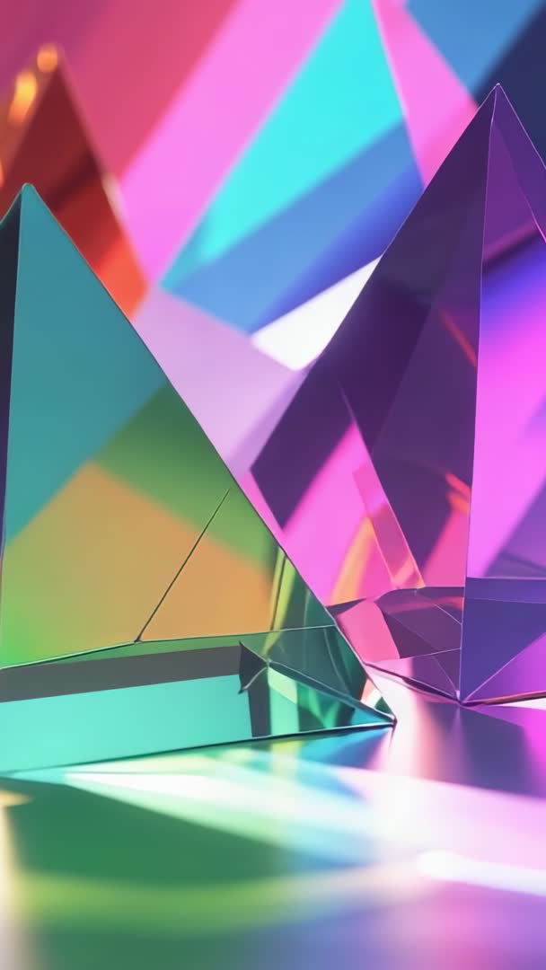 AI Generated Image. Panning across faceted purple and green glass prisms, refracting neon colors and casting kaleidoscopic reflections across glossy surface. Vertical composition highlighting sharp geometry, translucent planes, and vibrant color gradients. Working well as background for mobile content, social stories, app intros, digital ads, electronic music visuals, and title sequences. Enhancing product presentations, tech branding, fashion editorials, event visuals, and motion graphic projects. Offering loopable motion and close-up detail for dramatic transitions and hero screens. Color palette featuring magenta, cyan, teal, emerald, and violet with strong contrast and specular highlights. Delivering futuristic, elegant, and playful mood suitable for modern design campaigns and UI showcases. File crop and pan accommodating vertical formats for phones and social platforms.