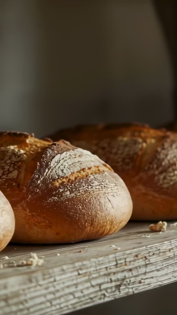 AI Generated Image. Panning across rustic artisan bread loaves, highlighting golden-brown crust, deep scoring, and flour-dusted surface. Shot in vertical format for social platforms and mobile viewing. Perfect for bakery marketing, recipe reel intros, hero header video on culinary websites, packaging background, cooking class promos, menu displays, and food documentary sequences. Emphasizing natural light, warm tones, and tactile texture to evoke handcrafted quality and homestyle baking. Providing close-up detail for thumbnails, title screens, and looped clips for social reels. Allowing simple color grading and cropping for brand consistency and cross-platform reuse.