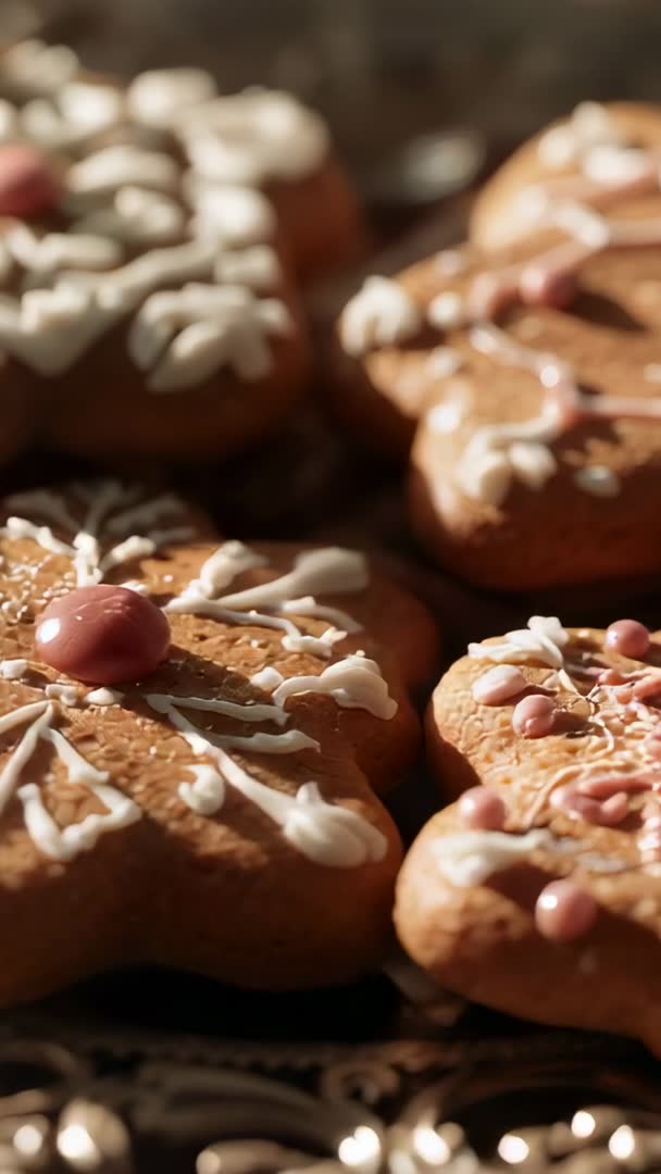AI Generated Image. Camera panning across star-shaped gingerbread cookies decorated with white and pink icing on ornate tray, warm sunlight highlighting crisp texture and sugar sparkle. Vertical frame and slow pan making it ideal for mobile-first platforms and short-form content. Perfect for creating holiday recipe reels, using as hero clip for bakery promotions, enhancing seasonal ad campaigns, overlaying text for social posts, complementing baking blog posts, serving as looped background for in-store displays and festive presentations. Color palette and close-up detail supporting product packaging mockups, menu boards, greeting card motion clips, and cookbook video stills.