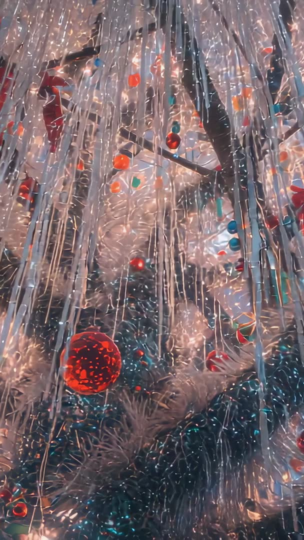 AI Generated Image. Camera panning down holiday tree in hall, showing cascading tinsel, twinkling LED lights, reflective baubles and soft bokeh highlights. Composition focusing on vertical motion and layered sparkle creates cinematic festive mood and elegant seasonal texture. Clip working great for social media reels, stories, mobile ads, seasonal website banners, e-card animations, in-store display loops and background for holiday product showcases. Portrait 9:16 orientation ideal for smartphone vertical formats and short-form video. Color palette featuring warm glow and jewel tones, offering easy color grading and overlay of text or logos for promotional use.