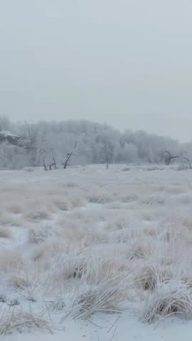 AI Generated Video. Vertical clip panning down across frosted grass clumps in snowy meadow, revealing bare trees along horizon. Muted cool palette and wide negative space in upper frame creating room for text overlay and titles. Camera movement slow and steady, suitable for slow-motion edit or loopable background. Use for vertical social media ads, Instagram Reels, TikTok, mobile wallpapers, weather forecast B-roll, seasonal branding, meditation and relaxation videos, travel and outdoor storytelling. Suggest adding ambient wind and distant wildlife sound, soft color grade with slight desaturation, gentle crossfade transitions and subtle vignette for cinematic mood. Frame offering clear top area for headline placement and lower area for logos or captions. Ideal for conveying solitude, winter calm, nature resilience, seasonal product promotion, or editorial winter features.