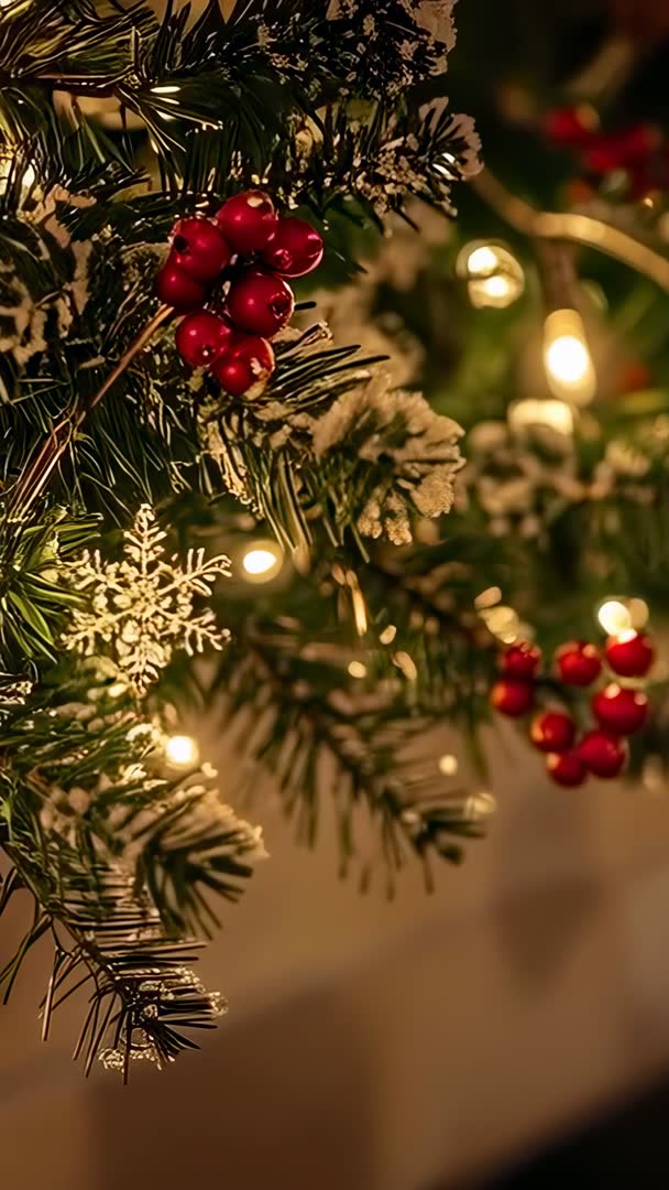 AI Generated Video. Panning across frosted pine garland with glowing warm lights, revealing clusters of red berries and delicate snowflake ornament. Creating cozy holiday mood and cinematic vertical format optimized for mobile viewing. Suited for social media stories, seasonal ads, greeting card videos, e-commerce hero banners, in-store digital signage, background loops for virtual events, holiday recipe and DIY craft tutorials. Leaving soft negative space at bottom for title or logo overlay. Featuring slow smooth motion, warm color palette, shallow depth of field and subtle bokeh highlights to enhance festive atmosphere and product or text focus.