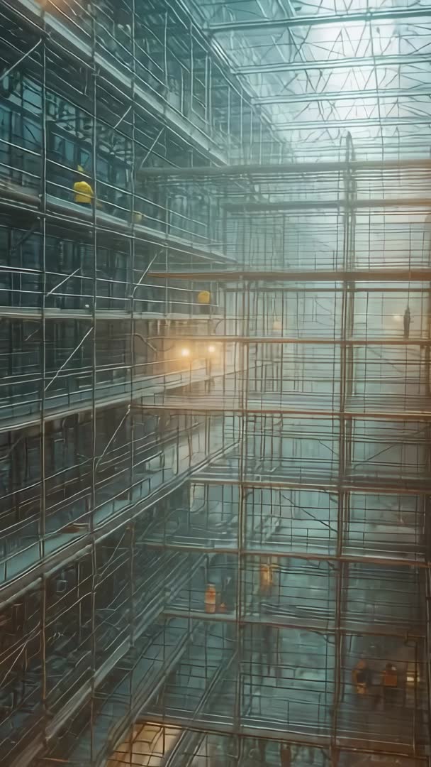 AI Generated Image. Vertical video panning through multi-level scaffolding in glass atrium, showing workers wearing hi-vis gear conducting inspection and maintenance. Strong grid of metal framework and walkways creating deep perspective and repeating geometric patterns. Soft daylight filtering through glass ceiling producing atmospheric haze and warm highlights on metal rails. Footage suitable for construction safety training, site inspection reports, architecture and engineering presentations. Ideal for social vertical content like Instagram Reels and TikTok, corporate progress updates, insurance documentation, and b-roll for documentaries or news features. Slow cinematic pan providing room for overlay text, lower-thirds, and title cards. High resolution and vertical composition optimized for mobile viewing and portrait-oriented storytelling.