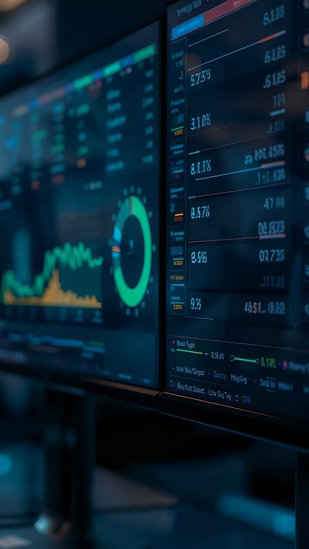 AI Generated Image. Showing vertical pan across multi-monitor trading dashboard displaying live market charts, line graphs, and circular performance gauge. Capturing close-up numerical tickers, percentage changes, and data widgets on dark UI, creating high-tech financial mood. Perfect for fintech marketing, trading platform demos, financial news segments, app store previews, corporate presentations, UX case studies, and vertical social ads. Helping explain real-time analytics, algorithmic trading, portfolio tracking, risk management, and market monitoring. Framing vertical for mobile and social platforms to fit Instagram Stories, TikTok, Snapchat, and mobile-first web layouts. Allowing easy overlay of logos, headlines, animated text, and lower thirds for branding and messaging. Suitable for hero banners, background loops in trading rooms, b-roll for business documentaries, and investor relations videos. Providing cinematic shallow depth of field and moody blue color palette for modern tech aesthetic.
