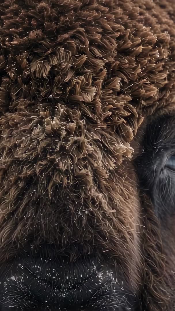 AI Generated Video. Footage showing extreme close-up of bison nose and coarse fur, snowflakes clinging to whiskers and muzzle, panning upward toward eye at frame edge. High-detail texture capturing individual hairs, frosty flakes, subtle breathing movement, offering immersive nature moment. Serving well for wildlife documentary sequences, conservation campaigns, educational clips about tundra ecosystems, TV or web commercials seeking rugged natural aesthetic, social media vertical ads and reels, museum exhibit displays, background loop for nature-themed retail or hospitality spaces. Compatible with slow-motion editing, color grading for cinematic tone, looping for seamless playback.