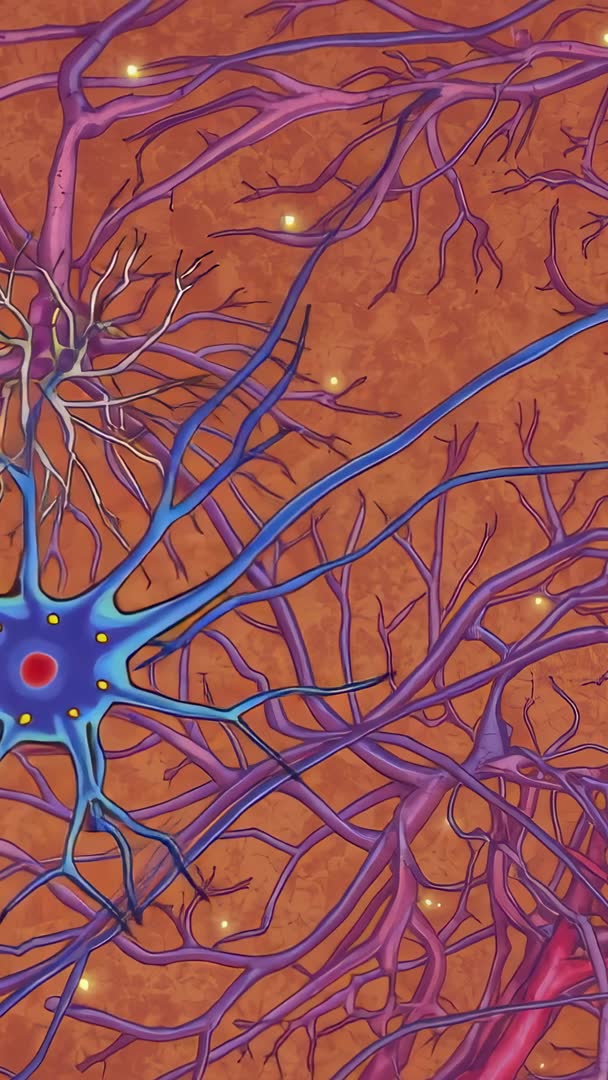 AI Generated Image. Video showing panning shot focusing on blue neuron with branching dendrites and extended axon weaving through warm orange brain tissue. Yellow luminescent dots appearing along branches, suggesting synaptic signaling and neural communication. Red vascular strand crossing frame, adding anatomical contrast and depth. Visual style blending scientific illustration with stylized color palette, creating engaging educational asset. Useful for neuroscience lectures, medical training modules, health technology marketing, scientific presentations, explainer videos, and social media vertical content. Optimized for mobile formats such as Instagram Reels, TikTok, and stories, and suitable as background for conference intros, e-learning segments, and research outreach material.